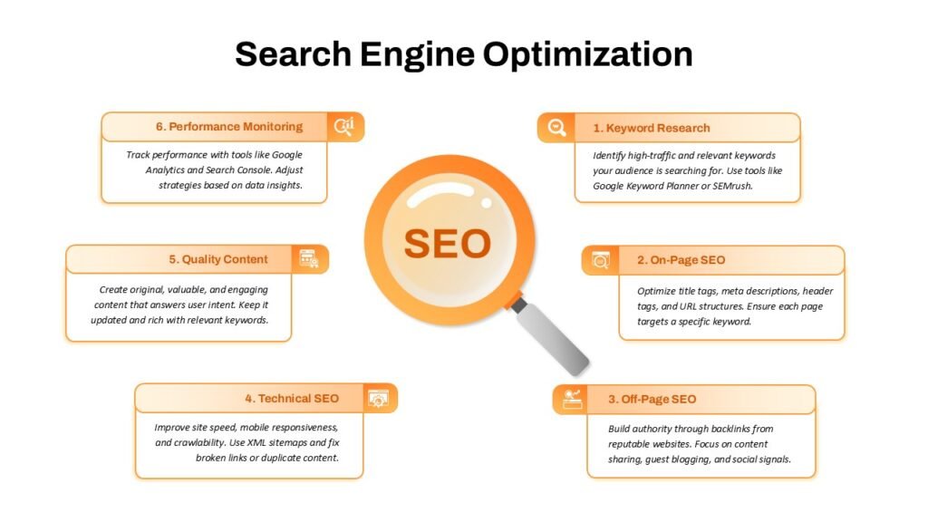 Our SEO services include keyword research, on-page SEO, technical SEO, content optimization, link building, local SEO, and performance tracking to improve search engine rankings and organic traffic.